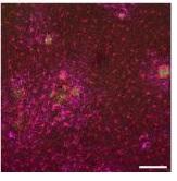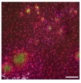 Une thérapie qui « marche » chez la souris : ainsi les cellules de cortex de souris n'ayant pas reçu la thérapie génique présentent des plaques amyloïdes (en vert), entourées par les cellules gliales (Voir visuel du haut).