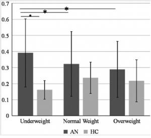 · Des images de personnes de poids normal ou en surpoids ne déclenchent pas chez ces patientes (« AN » sur schéma ci-contre) de réactions différentes à celles de sujets sains (« HC » : Healthy controls).