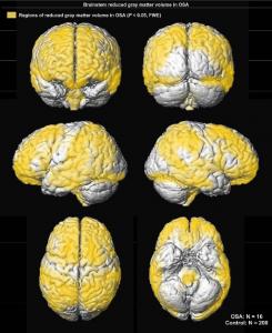 L'analyse des scans IRM constate chez les enfants atteints de SAOS des réductions significatives de la matière grise ou cellules du cerveau dans plusieurs zones du cerveau impliquées dans le mouvement, la mémoire, les émotions, la parole, la perception, la décision et la maîtrise de soi. Ainsi (visuel ci-contre), dans les zones corticales (en jaune) le volume de matière grise est considérablement réduit. Il existe une forte corrélation entre cette perturbation du sommeil et la sévérité de la perte de neurones ou du retard de la croissance neuronale dans le cerveau en développement. Enfin, si ces réductions de matière grise apparaissent assez étendues, leurs conséquences directes restent difficiles à préciser et à évaluer.