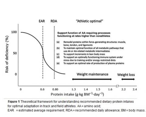 Les athlètes d’athlétisme s’engagent dans un entraînement intense qui impose un stress considérable aux systèmes physiologiques, ce qui rend nécessaire un soutien nutritionnel (et une réhydratation) pour une récupération optimale. Ces sportifs ont besoin d’un apport en protéines alimentaires supérieur aux besoins définis en population générale et dans différents pays estimés entre 0.80 à 1,0 g par kg de masse corporelle (BM) /jour, à la fois pour permettre l’adaptation à l'entraînement, mais aussi réguler la composition de la masse corporelle (masse maigre vs masse grasse) et optimiser les performances.