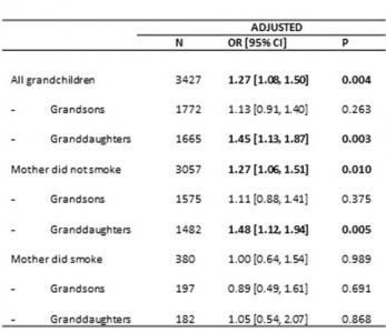 -les petites-filles de grands-mères maternelles ayant fumé pendant la grossesse, présentent un risque accru de 67% de TSA, seulement si la mère de la jeune fille n'est pas fumeuse,