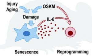 Une relation entre les dommages tissulaires et la reprogrammation cellulaire est médiée par une molécule pro-inflammatoire, l'interleukine-6 ​​(IL6). Sans sa présence, les gènes OSKM sont beaucoup moins efficaces à induire le processus de reprogrammation. Les chercheurs décryptent ainsi la cascade moléculaire suivante :