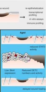 · chez la souris âgée, toutes les étapes semblent ralenties aux niveaux de l'activité des différents types de cellules, des voies moléculaires ainsi que des systèmes de signalisation. Un ralentissement de quelques secondes à des mois. Ainsi, les kératinocytes des souris âgées, situés à proximité des berges de la plaie qui communiquent normalement avec les cellules immunitaires par le biais de protéines connues sous le nom de Skint, ne parviennent plus, avec le vieillissement, à émettre ces signaux immunitaires.