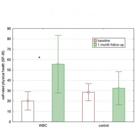- le score physique moyen s'est amélioré de 21,3 à 55,6, et le score de santé mentale moyen de 30,1 à 60,4, alors que le groupe témoin ne bénéficie pas de changements significatifs.