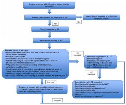 Les lignes directrices actuelles concernant la thérapie systémique dans la dermatite atopique sévère restent mal comprises ou non utilisées. Le traitement comprend encore trop fréquemment l'utilisation inappropriée de corticostéroïdes systémiques et d'immunosuppresseurs systémiques non approuvés, et ces médicaments vont réduire la force de la réponse immunitaire du corps. De plus, les directives internationales en matière de traitement diffèrent considérablement d'un pays à l'autre. Cet examen clinique des directives nationales et internationales aboutit à un algorithme complet plus consensuel, permettant de guider les cliniciens dans le traitement de ces patients.
