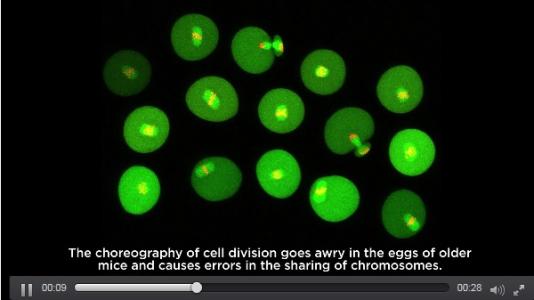 Les chercheurs du Centre de recherche du Centre hospitalier de l'Université de Montréal (CRCHUM), grâce à des techniques de microscopie avancées, observent, pour la première fois un défaut particulier dans les ovules (ovocytes) de souris. Ce défaut se retrouverait également dans les ovules de femmes plus âgées. Lors de la division cellulaire, la chorégraphie dérape et entraîne des erreurs dans le partage des chromosomes : « Nous avons découvert que les microtubules qui orchestrent la séparation des chromosomes lors de la division cellulaire sont anormaux dans les ovules plus âgés. Au lieu de former une structure qui se déploie de façon contrôlée et parfaitement symétrique, appelée le fuseau, les microtubules vont dans toutes les directions », résume l'auteur principal, Greg FitzHarris, professeur à l'Université de Montréal.