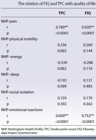 A la sévérité globale des symptômes et au nombre de sites sensibles (TPC) sont directement liés non seulement la douleur -qui se confirme comme le symptôme majeur et prioritaire à prendre en charge- mais également les réactions émotionnelles évaluées dans le cadre de l'échelle de qualité de vie.