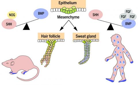 Les glandes sudoripares, un défi pour la recherche : car contrairement aux humains, où les glandes sudoripares et les follicules pileux coexistent, les glandes sudoripares de la plupart des mammifères, y compris des souris de laboratoire, sont limitées à de petites régions dépourvues de poils comme la patte. Dans un embryon en développement, de petites indentations appelées placodes (ou ébauches de cellules) se forment dans la couche de cellules qui deviendra la peau. Le sort de ces placodes, qu'elles se transforment en follicules pileux ou en glandes sudoripares, dépend des signaux moléculaires qu'elles reçoivent. L'identification de ces 2 grandes voies de signalisation qui s'opposent ou s'annulent détermine donc le sort de ces placodes : chez la souris, pour qu'un follicule pileux se forme, une protéine de signalisation appelée sonic hedgehog (SHH) doit être présente et dominer une autre protéine de signalisation connue sous le nom de bone morphogenetic protein (BMP). Dans le cas des glandes sudoripares, c'est le contraire : des niveaux élevés de BMP déclenchent une voie de signalisation qui réduit SHH au silence.