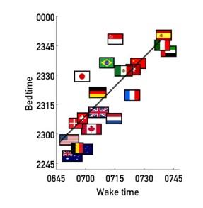 · la durée du sommeil diminue avec le caractère tardif de l'heure du coucher : alors que l'heure moyenne du coucher varie selon les pays, l'heure moyenne du réveil reste relativement constante.