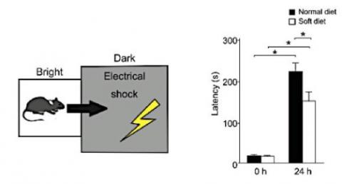 Les changements dans la mastication peuvent moduler la neurogénèse et l'activité neuronale dans l'hippocampe : les chercheurs constatent ici que la croissance de l'os et du muscle maxillo-faciaux est supprimée chez des souris modèle de fonction masticatoire réduite, via un régime à base d'aliments en poudre. Les expériences comportementales menées chez l’animal confirment que la réduction de la mastication entrave la mémoire et les fonctions d'apprentissage (visuel ci-contre). Dans l'hippocampe, une composante majeure - les « C-Fos-positive neurons » - responsable de la mémoire, de l'activité neurale, de la formation de synapses et de l'expression du facteur neurotrophique dérivé du cerveau (BDNF) est réduite en cas de réduction de la mastication.