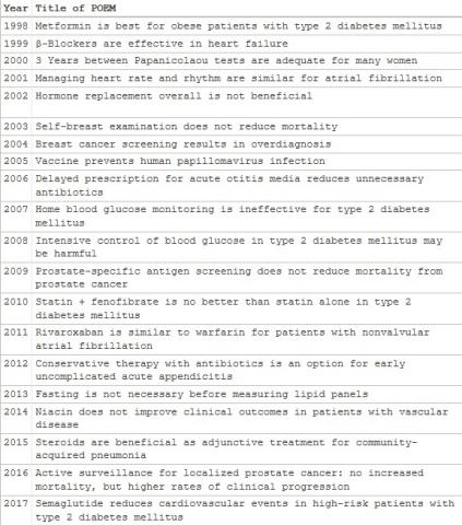 Les POEM (Patient Oriented Evidence That Matters) sont des études qui traitent d'une question clinique pertinente, démontrent une amélioration des résultats « orientés patient » et ont le potentiel de modifier la pratique clinique. Ce rapport, présenté dans les Annals of Family Medicine, identifie les POEM au cours de chacune des 20 dernières années qui ont été les plus moteurs de changements majeurs et durables dans la pratique médicale.