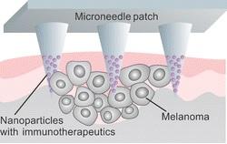 Ce patch à microaiguilles qui va délivrer ces anticorps sur le site de la tumeur, relève naturellement ces défis. Ses micro-aiguilles fabriquées à partir d'acide hyaluronique, un matériau biocompatible, sont en contact avec des nanoparticules, chargées d'anticorps. Appliqué « sur » le mélanome, le sang pénètre dans les microaiguilles, le glucose du sang permet de décomposer lentement les nanoparticules et de permettre la diffusion de l'anticorps dans la tumeur.