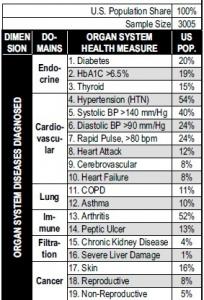 L'étude a évalué la santé et le mode de vie de 3.005 adultes américains, âgés de 57 à 85 ans, puis a réévalué leur santé, leur incapacité ou…leur décès 5 années plus tard. Les chercheurs ont évalué 2 modèles pour voir celui qui estimait le mieux les risques pour la santé, un premier basé sur le développement de maladies, un deuxième prenant également en compte le mode de vie, le bien-être psychologique, la mobilité et la santé. Ainsi, précisément, le modèle complet comprenait aussi des facteurs supplémentaires couvrant 5 grandes dimensions de la santé et du bien-être, soit,