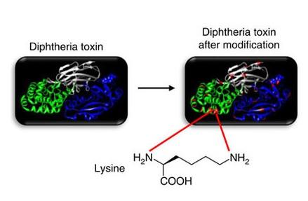 L'élimination de neurones spécifiques à l'extérieur du cerveau déclenche l'obésité : avec des collègues de l'Université de Cambridge, l'équipe de recherche a modifié un outil moléculaire largement utilisé, basé sur l'utilisation de la toxine diphtérique. Cette toxine ne tue que les cellules qui portent son récepteur, des cellules qui n'existent pas chez la souris, sauf à introduire ces récepteurs artificiellement dans des cellules spécifiques que l'on veut suivre et étudier. L'équipe a ainsi génétiquement introduit le récepteur de la toxine diphtérique dans les neurones des souris qui engendrent de la graisse, ce qui rendrait les neurones sensibles à l'action mortelle de la toxine. Cependant, la manipulation génétique a malheureusement introduit aussi le récepteur de la toxine diphtérique dans des neurones du cerveau, ce que les chercheurs ne souhaitaient pas. Par conséquent, l'équipe a dû se tourner vers un autre outil, a modifié chimiquement la toxine diphtérique, en augmentant sa taille (Visuel ci-contre) pour bloquer ainsi son accès au cerveau. Ainsi, les chercheurs sont parvenus à éliminer les neurones du tissu adipeux des souris, sans toucher le cerveau.