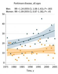 · Globalement, des tendances d'augmentation avec le temps, plus claires chez les hommes que chez les femmes : si la maladie de Parkinson a tendance à affecter davantage les hommes que les femmes, l'augmentation est plus dramatique chez les hommes et cette différence est accueillie comme une incitation à mieux comprendre les causes environnementales de la maladie.