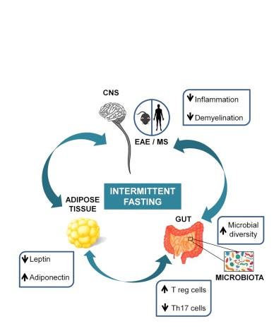 Le Dr Laura Piccio, professeur agrégé de neurologie à l'École de médecine de l'Université de Washington, face au manque de preuves et aux multiples anecdotes sur les effets de l'alimentation sur les symptômes de la SEP a lancé un essai pour évaluer si la réduction drastique des calories, 2 fois par semaine modifie le système immunitaire et le microbiome intestinal, et pourrait ainsi changer le cours de la maladie. Une précédente étude menée sur la souris avait déjà suggéré les bénéfices du jeûne intermittent sur un modèle animal de SEP (Voir visuel ci-dessous).