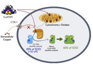 Le cuivre-ATSM, un composé bien connu, contribue à fournir en cuivre spécifiquement les cellules dont les mitochondries -ces petites centrales énergétiques des cellules- sont endommagées. De plus le composé peut atteindre la moelle épinière en traversant facilement la barrière hémato-encéphalique. Il présente une faible toxicité, et, enfin, est déjà utilisé en médecine à des doses beaucoup plus faibles. Son action est efficace contre la détérioration et la mort des neurones moteurs de la moelle épinière, déjà liée à des mutations dans le cuivre et le zinc superoxyde dismutase.