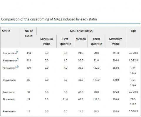 Les effets musculosquelettiques apparaissent entre 24 et 43 jours de traitement : le délai d'apparition des MAEs induits par l'atorvastatine et la rosuvastatine sont respectivement de 24 et 30 jours, donc plus court que ceux associés à la simvastatine (43 jours). Le délai d'apparition des MAEs induits par la pravastatine, la lovastatine et la fluvastatine est similaire à celui de la simvastatine, soit 40 jours en général.