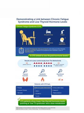 Ces scientifiques néerlandais l’appellent le « Low T3 Syndrome » et documentent ainsi un lien crucial entre le syndrome de fatigue chronique et des niveaux inférieurs d'hormones thyroïdiennes clés. Cette étude, présentée dans la revue Frontiers in Endocrinology émet l'hypothèse que le syndrome de fatigue chronique (SFC) est causé par une faible activité des hormones thyroïdiennes en l'absence de maladie thyroïdienne, et, ce faisant, ouvre l’espoir de développer enfin un traitement pour cette maladie prévalente et handicapante.