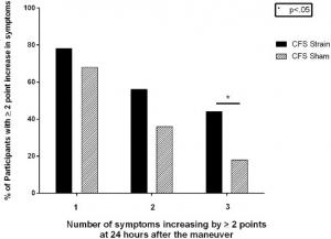 Les chercheurs de l'Université d'Alabama à Birmingham et de la Johns Hopkins ont évalué 80 participants dont 60 diagnostiqués avec le SCF et 20 témoins sans CFS, pour leurs niveaux de fatigue, de douleur, et la sévérités des autres symptômes courants de la maladie, comme les vertiges, les troubles de la concentration, les maux de tête, chaque 5 mn et durant 15 minutes au total, alors que les participants, allongés sur le dos sur une table d'examen, subissaient une élévation de la jambe droite de manière à ressentir une légère pression musculaire et nerveuse. Les participants ont été contactés 24 heures plus tard et ont rapporté à nouveau leurs symptômes. Les participants atteints de SFC ayant subi cette tension musculaire et nerveuse à la jambe rapportent :