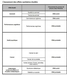 · Cancer : au-delà de l'évaluation du Circ, l'expertise de l'Anses conclut en faveur d'un effet du travail de nuit sur le risque de cancer du sein, mais avec des éléments de preuve limités, d'un effet possible sur le risque de cancer de la prostate, mais avec des éléments de preuve insuffisants, et, globalement d'un effet probable du travail de nuit sur le risque de « cancer, en général ».