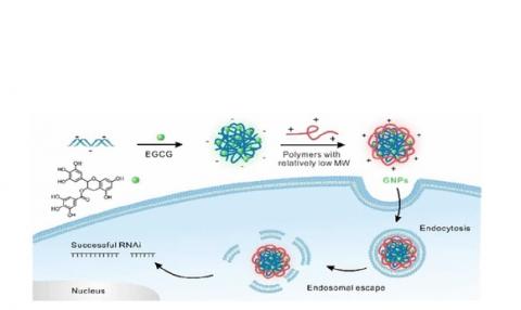 Ces petits ARN interférents (siRNA : Small interfering RNAs) ont un grand potentiel thérapeutique car ils peuvent composer avec l'expression de gènes liés à la maladie. Cependant, « insérer » des siRNA dans des cellules où ils peuvent agir, reste complexe. De taille relativement conséquente et chargés négativement, les siRNA ne peuvent pas facilement traverser la membrane cellulaire et sont susceptibles d’être dégradés par des enzymes. Pour surmonter ces problèmes, certains chercheurs ont essayé de revêtir ces siRNA avec différents polymères. Cependant, la plupart des petits polymères ne parviennent pas à acheminer les siRNA dans les cellules, alors que les plus gros polymères peuvent être efficaces mais sont généralement toxiques. Les chercheurs de l’East China Normal University (Shanghai) et de la South China University of Technology se sont demandé s’ils pouvaient utiliser l’EGCG, qui se lie fortement à l’ARN, en combinaison avec un petit polymère pour former des nanoparticules qui transmettraient sans danger les siRNA dans les cellules.