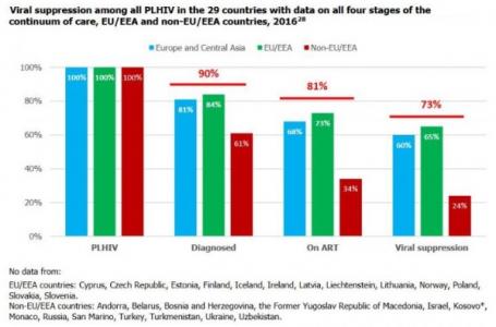 Sur la base des données des 37 pays déclarant en Europe et en Asie centrale on estime à environ 1,2 million, le nombre de personnes vivant avec le VIH, dont près de 900.000 diagnostiqués. Cela signifie aussi que 25% des personnes infectées par le VIH ne bénéficient toujours pas de traitement. Sur une base de 600.000 patients diagnostiqués et sous TARV, 88% parviennent à la suppression de la charge virale.