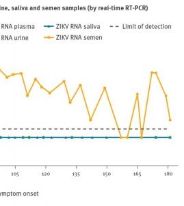 Les chercheurs de l'Université de Padoue (Italie) décrivent la dynamique du virus Zika chez ce patient âgé de 40 ans, qui de retour d'Haïti développe une fièvre et une éruption cutanée et qui par tests de laboratoire est diagnostiqué positif avec présence détectable du virus à 9 jours après les symptômes dans le plasma, à 15 jours dans les urines, à 47 jours dans la salive, mais à 181 jours dans le sperme.