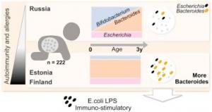 bactérienne, connus pour leur capacité à déclencher le système immunitaire suivent des processus différents selon les microbiomes. Ainsi lorsqu'il s'agit de microbiomes d'enfants russes, ce sont les LPS d'E. coli qui mènent la charge, mais dans les microbiomes finlandais et estoniens, ce sont les LPS des Bacteroides qui règnent en maîtres. Certains LPS s'avèrent même incapables d'activer le système immunitaire et vont même étouffer les LPS d'autres bactéries du microbiote.