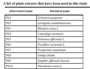 6 extraits végétaux à la loupe : ces 6 extraits (PE4 : Cimicifuga racemosa, PE5 : Valeriana officinalis L., PE6 : Passiflora incarnate L., PE8 : Ginkgo biloba, PE12 : Apium graveolens L., PE21 : Salix alba)- Voir tableau ci-contre - ont été sélectionnés pour être connus comme impliqués dans des voies de signalisation elles-mêmes antivieillissement, qui augmentent la longévité, au contraire d'autres voies de signalisation qui accélèrent le vieillissement et réduisent la longévité. On sait qu'il est possible d'activer ces différentes voies par certains éléments nutritifs ou certaines hormones.